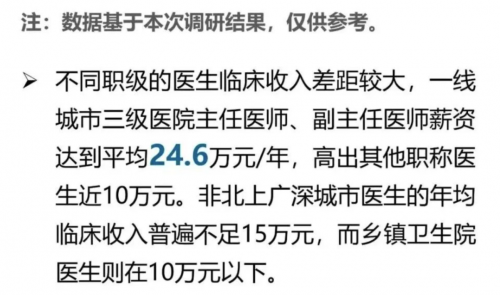 而且,据《中国医院人力资源现状调研报告》显示:只有一线城市部分医院的高级职称医生,年收入能达到20万以上;三四线城市的医生年薪平均不到15万;到了乡镇医院,收入只会更低。