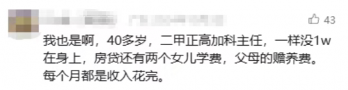 当然,存款1万只是个例,但它反映出的问题却很有代表性。以40岁中年医生为例,他们正处于上有老下有小的艰难期,父母赡养需要钱、子女教育需要钱、房贷车贷也需要钱,和大多数普通人一样,每月工资刚到账,一大半收入就先填了这些窟窿。