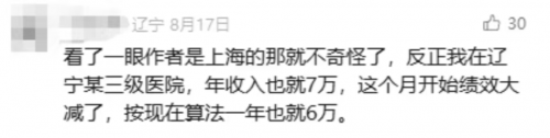 辽宁某医院的医生就吐槽过:以前年收入能有7万,现在绩效大幅缩减,一年到手只剩6万。还有人从医19年,收入最高的一年拿过12万,现在能稳定在8万就烧高香了。