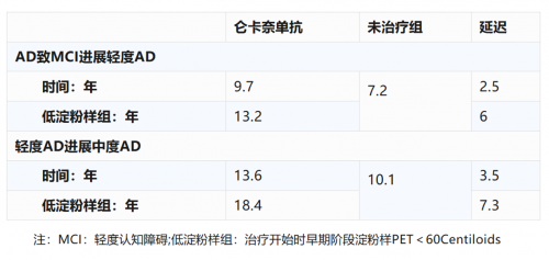在3期临床研究Clarity AD开放标签扩展(OLE)和16个单抗治疗AD临床研究数据估算10年长期AD进展和基线仑卡奈单抗延缓疗效上,AD导致MCI进展至轻度AD延迟2.5年,轻度AD进展至中度AD延迟3.5年。