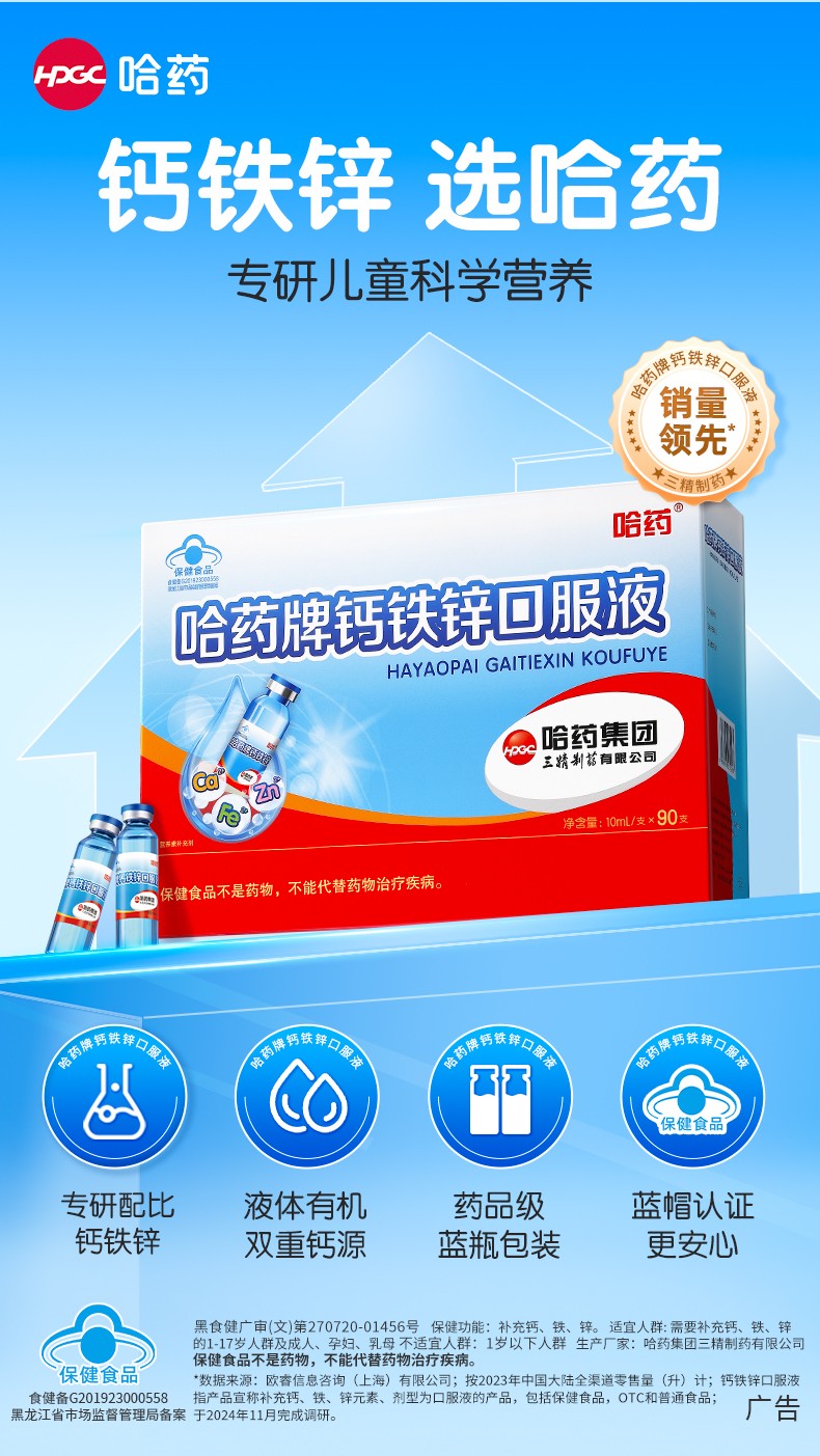 当前,我国1-6岁儿童普遍存在钙、铁、锌摄入不足的问题。面对这一严峻的营养困局,单一补充或盲目进补已非良策。哈药钙铁锌口服液凭借其独创的“钙铁锌三元同补”科学理念,为解决这一难题提供了高效、便捷的答案,连续两年蝉联全国销量第一。
